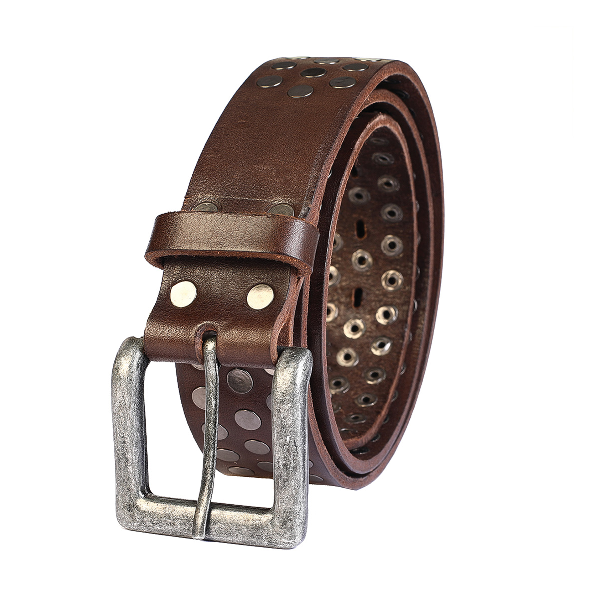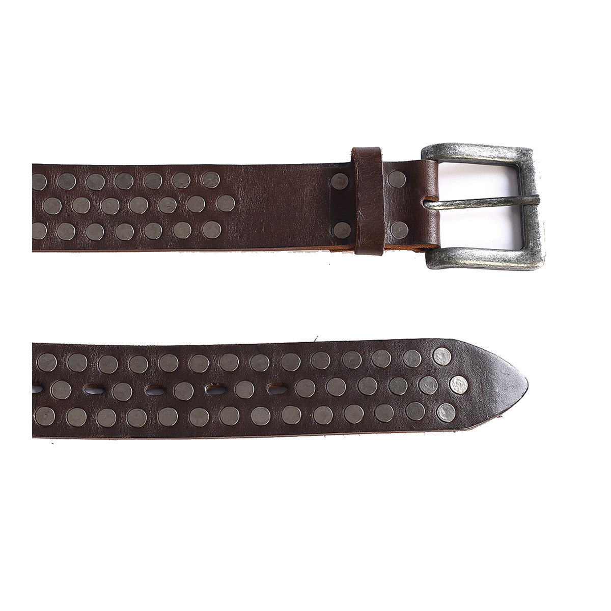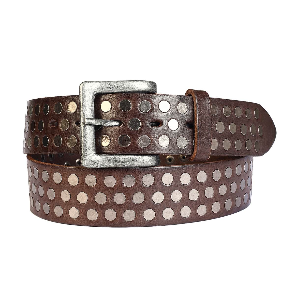 El cinturón Boris esta compuesto por una resistente lonja de cuero vacuno vegetal de 4.0 cm de ancho, de alta calidad y durabilidad, cubierto por remaches metálicos color plata vieja y hebilla de zamak color plata vieja.