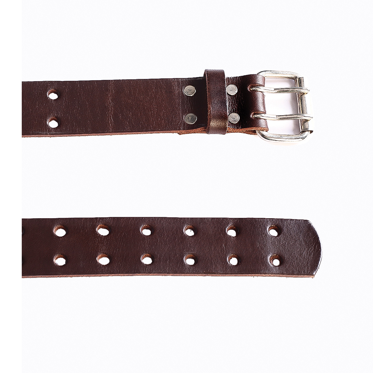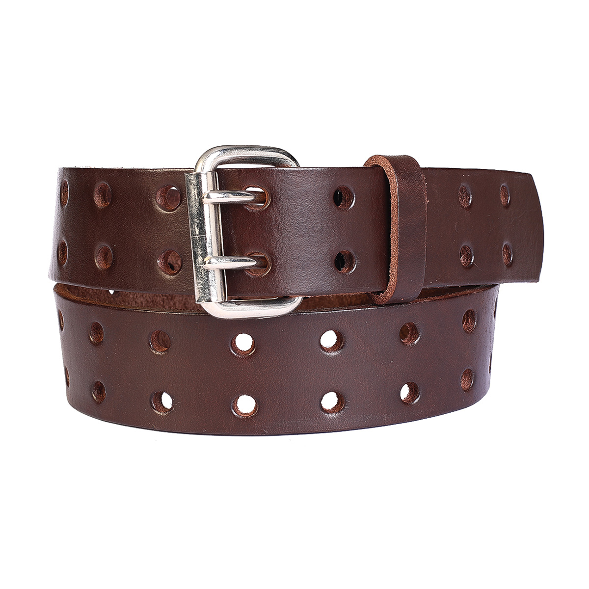 El cinturón Born esta compuesto por una resistente lonja de cuero vacuno vegetal de 4.0 cm de ancho, de alta calidad y durabilidad, dos filas troqueladas en circular y hebilla de zamak color níquel.