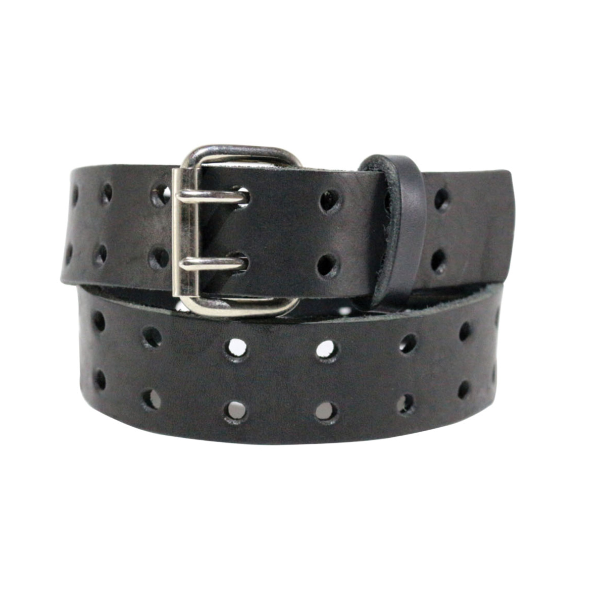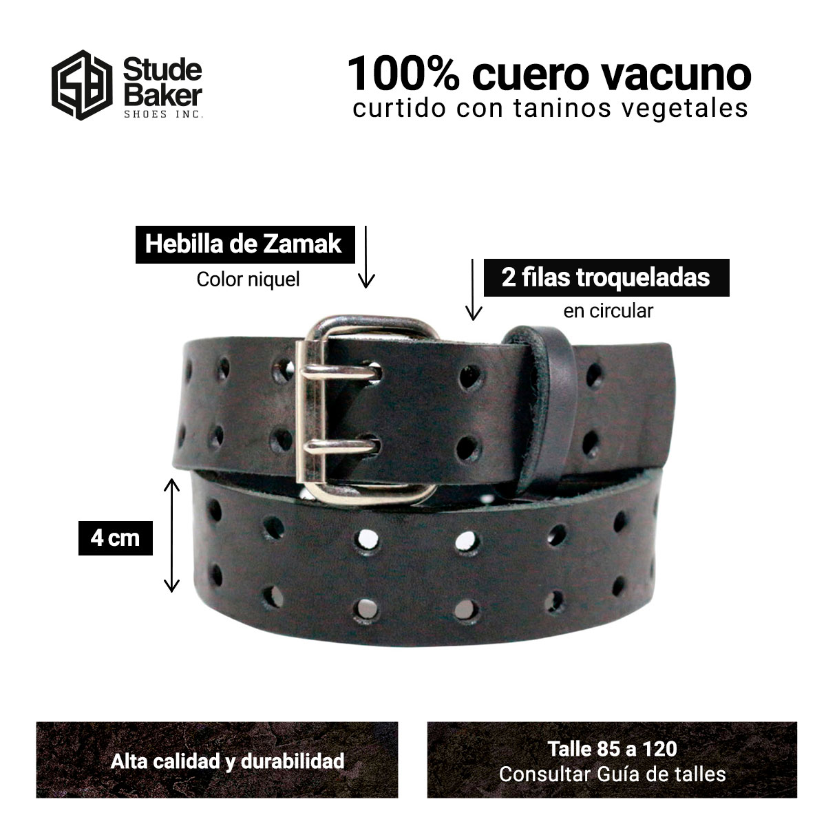 El cinturón Born esta compuesto por una resistente lonja de cuero vacuno vegetal de 4.0 cm de ancho, de alta calidad y durabilidad, dos filas troqueladas en circular y hebilla de zamak color níquel.