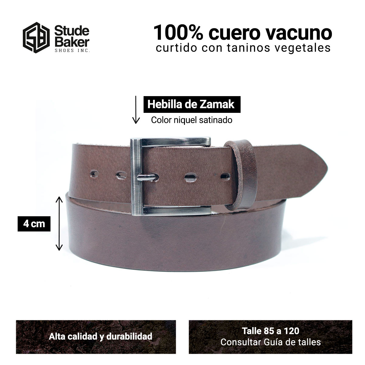 Cinturón compuesto por una resistente lonja de cuero vacuno vegetal de 4.0 cm de ancho, de alta calidad y durabilidad. Hebilla de zamak color Niquel Zatinado.