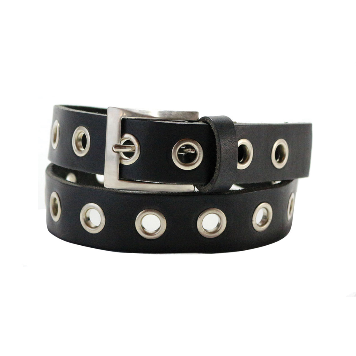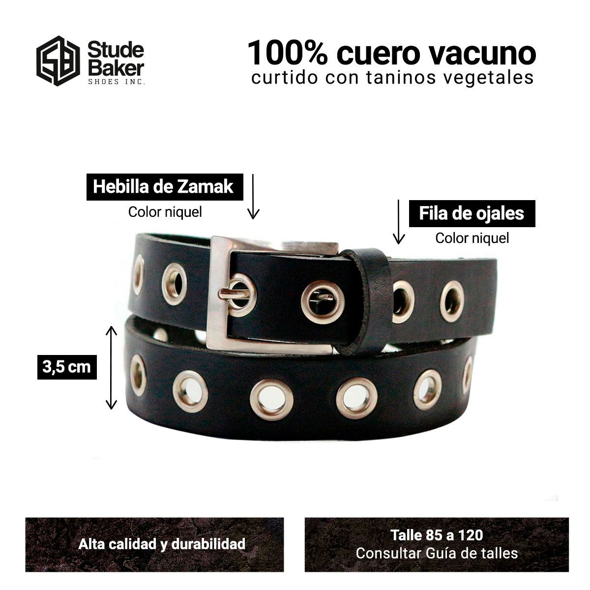 Cinturón compuesto por una resistente lonja de cuero vacuno vegetal de 3.5 cm de ancho, de alta calidad y durabilidad, cubierto por una fila de ojales color niquel. Hebilla de zanak color Niquel.