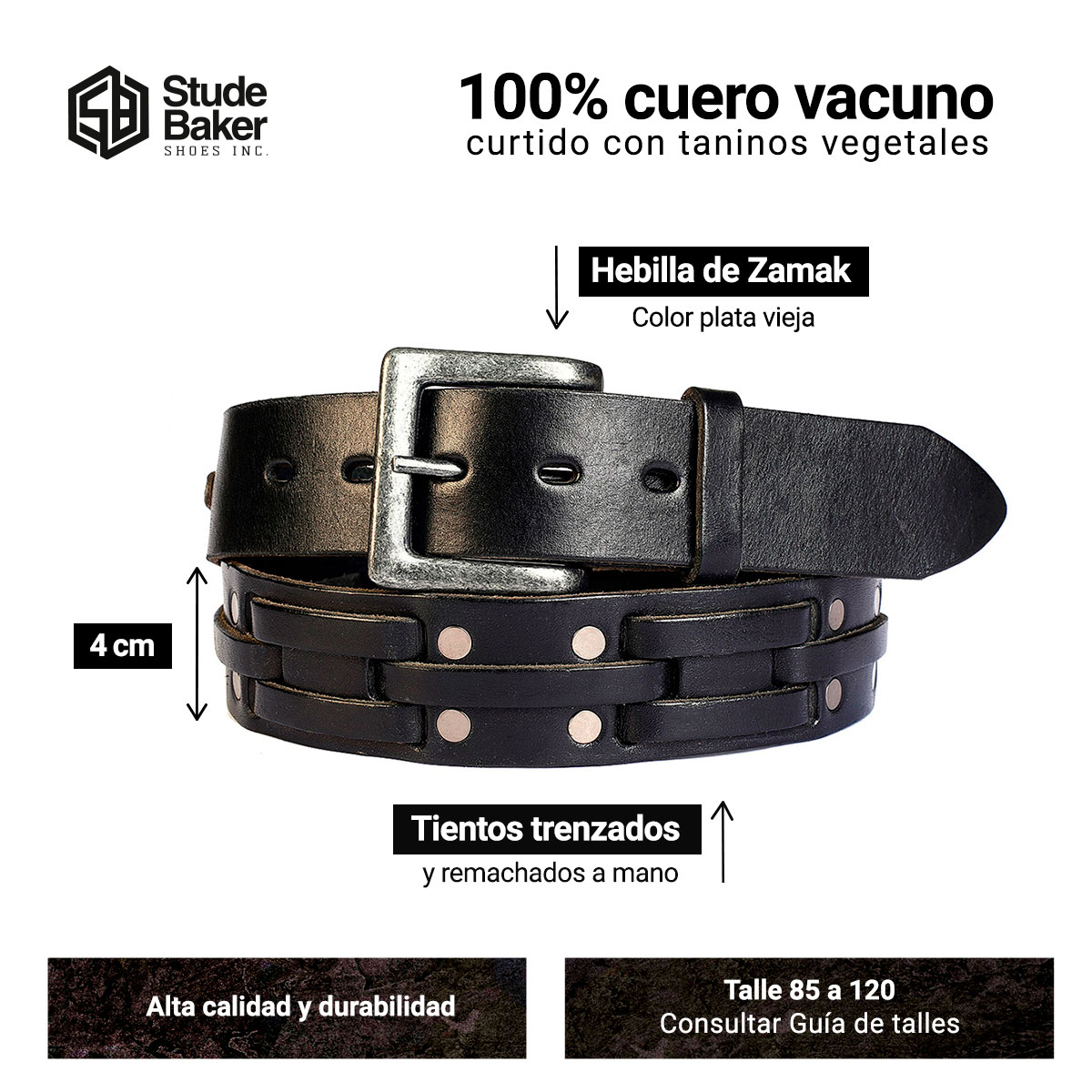 El cinturón Thunder esta compuesto por una resistente lonja de cuero vacuno vegetal de 4.0 cm de ancho, de alta calidad y durabilidad. Tientos trenzados y remachados a mano. Hebilla zamak color plata vieja.